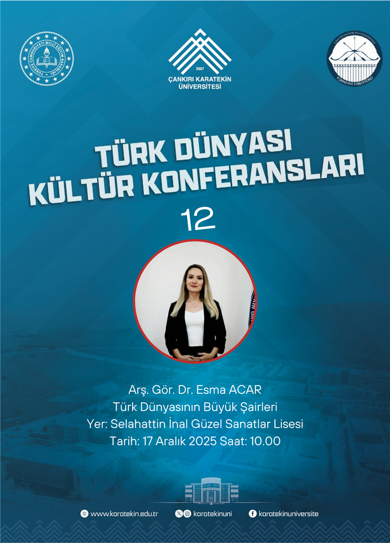 Türk Dünyası Kültür Konferansları’nın sonuncusu Arş. Gör. Dr. Esma Acar`ın "Türk Dünyasının Büyük Şairleri" başlıklı sunumuyla sona erdi. Çankırı Selahattin İnal Güzel Sanatlar Lisesinde gerçekleştirilen etkinlikte Acar, Türk Dünyasının iz bırakan şairlerini ve şiir örneklerini öğrencilerle buluşturdu.