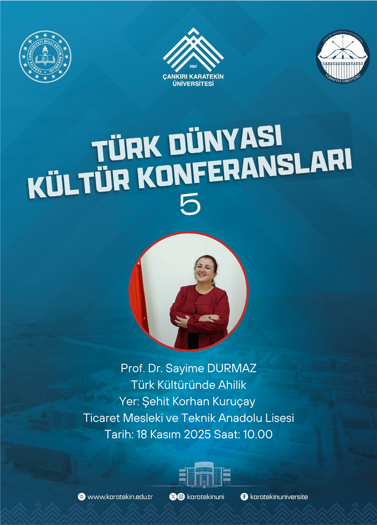 Enstitümüz ve Çankırı İl Milli Eğitim Müdürlüğü iş birliğiyle düzenlenen Türk Dünyası Kültür Konferansları serisinin beşinci programı, İnsan ve Toplum Bilimleri Fakültesi Tarih Bölümü Öğretim Üyesi Prof. Dr. Sayime Durmaz tarafından Şehit Korhan Kuruçay Ticaret Mesleki ve Teknik Anadolu Lisesi`nde gerçekleştirildi.