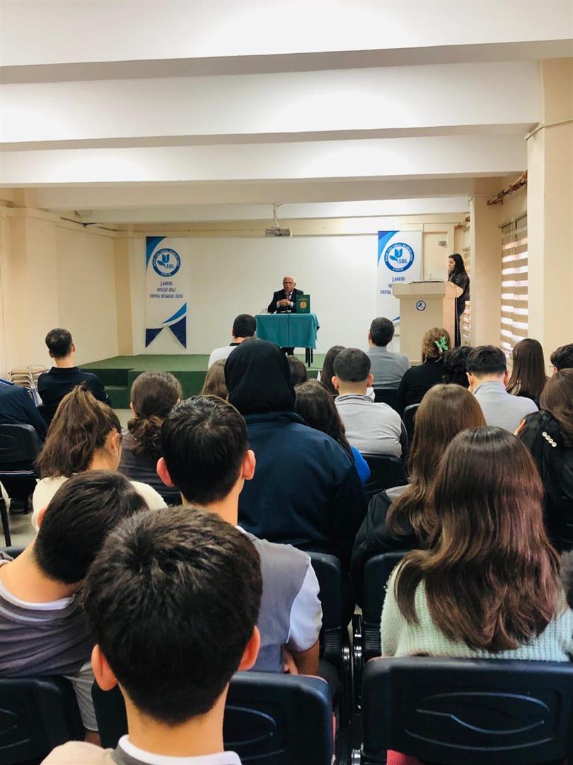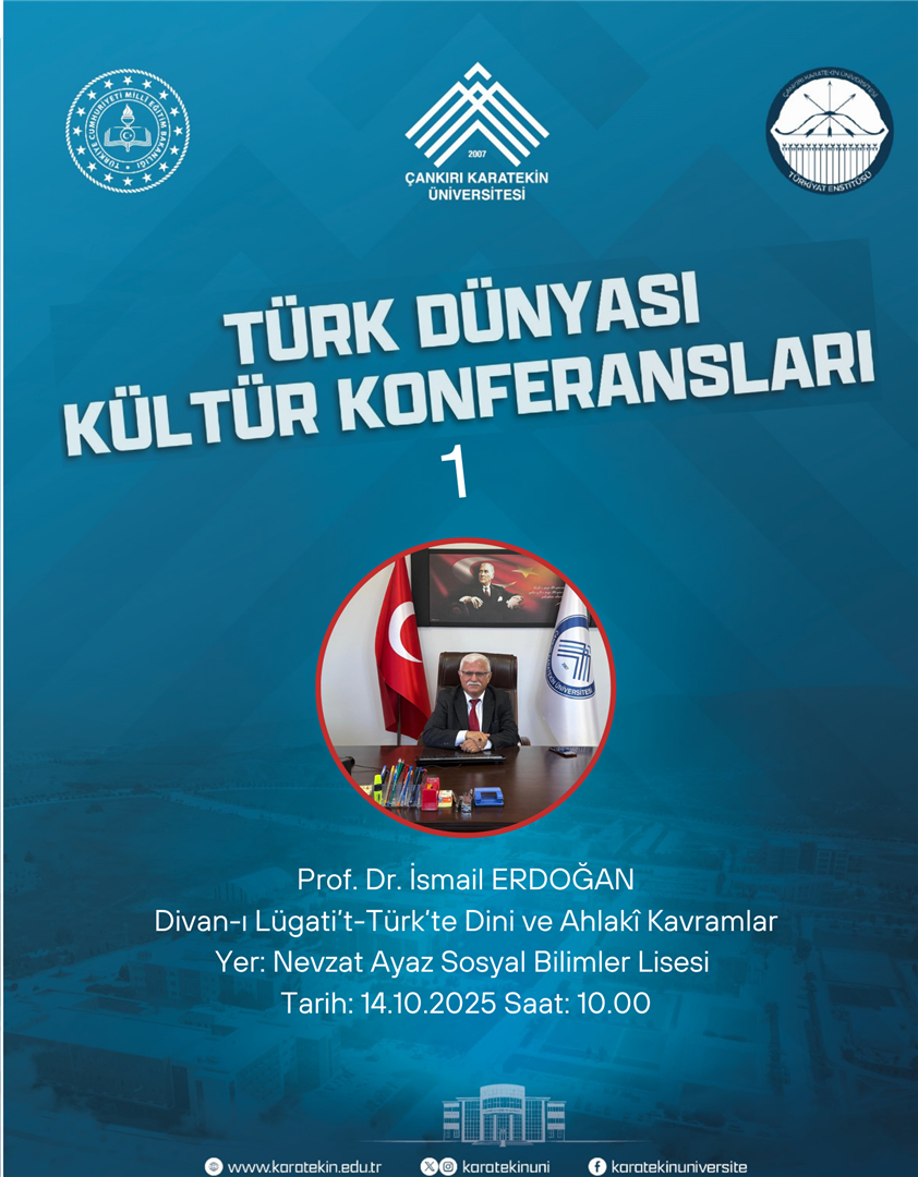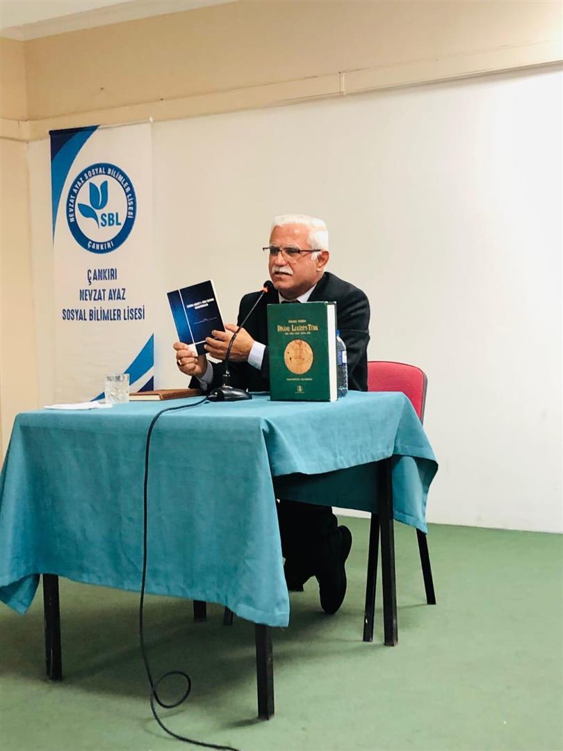 Enstitümüz ve Çankırı İl Milli Eğitim Müdürlüğü ile ortaklaşa düzenlenen Türk Dünyası Kültür Konferanslarının birincisi, İslami İlimler Fakültesi Öğretim Üyesi Prof. Dr. İsmail ERDOĞAN tarafından Nevzat Ayaz Sosyal Bilimler Lisesinde gerçekleştirildi. Türk dili ve lehçelerinden örneklerin gösterildiği programda Türk dilinin en önemli eserlerinden olan Divanu Lugâti`t-Türk tanıtıldı. Öğrencilerin yoğun ilgi gösterdiği programın ardından okul müdürü Mustafa Volkan KAVAK tarafından hocamıza plaket takdim edildi.
